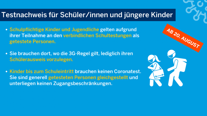 - Schulpflichtige Kinder und Jugendliche gelten aufgrund ihrer Teilnahme an den verbindlichen Schultestungen als getestete Personen.