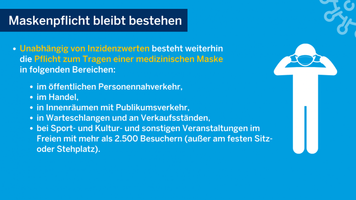 Es besteht weiterhin unabhängig von Inzidenz-Werten und für alle Personen die Pflicht zum Tragen einer medizinischen Maske in Innenräumen mit Publikumsverkehr.