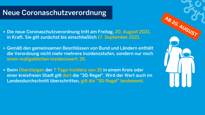 Ab Freitag, 20. August 2021 tritt die neue Coronaschutzverordnung in Kraft und gilt zunächst bis einschließlich 17. September 2021.